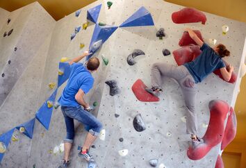 Der Berg ruft! In der Kletterhalle mit mehr als 800 qm Kletterfläche kann man sich so richtig austoben. Die farblich markierten Kletterstrecken haben unterschiedliche Schwierigkeitsstufen von „kinderleicht“ bis „extraschwer“. In einem Einsteiger- oder Familienkurs kann man alle notwendigen Klettertechniken erlernen. Die Ausrüstung kann man vor Ort leihen. Ein großer Boulderbereich mit weichen Matten am Boden dient zur Aufwärmung und ersten Versuchen ohne Seil. Der Gastronomiebereich hält kalte und warme Snacks zur Stärkung bereit.