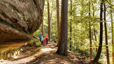 Filmreife Felskulisse aus Buntsandstein am bekannten Felsenwanderweg oberhalb des Ortsteils Neuhof der Stadt Rodalben.