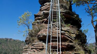 Abgesicherte Aussichtskanzel, die über eine Leiter erreichbar ist. Aussichtsfelsen mit Panoramablick auf Schönau und den Pfälzerwald.