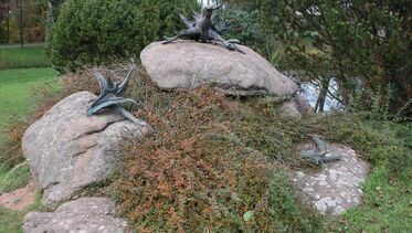 Elwetritsche-Denkmal am Haus des Gastes in Dahn. Das Elwetritsche-Denkmal zeigt eine „Elwetritsche-Familie“ und ist dem Schutzpatron der Elwetritsche, Gust Espenschied, gewidmet.