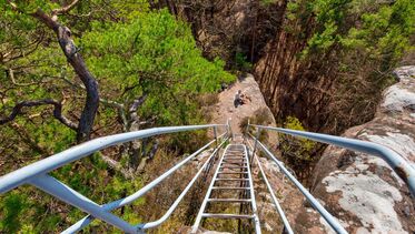 Abgesicherte Aussichtskanzel, die über eine Leiter erreichbar ist. Aussichtsfelsen mit Panoramablick auf Schönau und den Pfälzerwald.