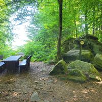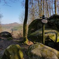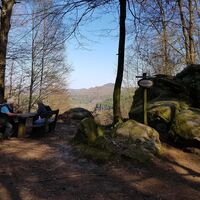 Am Münchweiler Höhenwanderweg (Teil 1 und 2) gelegener Felsen mit gemütlicher Sitzgruppe und wunderbarer Panoramaaussicht über die Berge und Wälder der Kernzone "Quellgebiet der Wieslauter" des Biosphärenreservats Pfälzerwald, die unmittelbar östlich angrenzt. Am einfachsten erreichbar ist der Wildsaufelsen vom Wanderparkplatz Sauweiher (kostenloses Parken) am Ende des Konrad-Adenauer-Rings der Gemeinde Münchweiler/Rodalb aus.