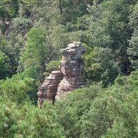 „Braut und Bräutigam“, die 2 wohl markantesten Felssäulen im Dahner Felsenland, unterhalb der Jugendherberge.
