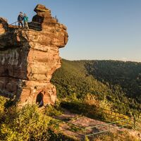 Der Drachenfels zählt zu den Hauptanziehungspunkten im Wasgau. Er ist vermutlich kurz nach 1200 errichtet worden. 1523 wurde die Burganlage fast völlig zerstört. Zwei steile und sehr schmale Buntsandsteinfelsen tragen die eindrucksvollen Ruinen der Burg Drachenfels. Das größte und am besten erhaltene Bauwerk ist der mächtige östliche Torbau. Ebenfalls erhalten sind zahlreiche Felsenkammern und Verbindungsgänge. Das Wahrzeichen der Burg (Umrisse einer Drachenfigur) war in der östlichen Wand der Kernanlage eingeritzt, wurde jedoch später teilweise beschädigt. Von der Burgruine hat man einen herrlichen Ausblick über das Biosphärenreservat Naturpark Pfälzerwald/Nordvogesen.