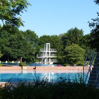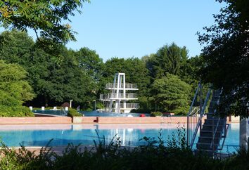 Warmfreibad in herrlicher Lage direkt am Freizeitgebiet. Sprungbecken mit Ein-, Drei- und Fünf-Meter-Sprungturm, 50-Meter-Schwimmerbecken, Nichtschwimmer-Spaßbecken mit Wasserrutsche, großes Kleinkinder- und Babybecken mit Wasserpilz und sprudelnden Elementen, großzügige Liegewiese, Beachvolleyballfeld und Kiosk mit Freiterrasse. 2015 entstand auf ca. 3000 m2 ein Wasser-Erlebnisspielplatz welcher das Freizeitangebot thematisch ergänzt. Er bietet besonders an heißen Tagen eine willkommene Abkühlung. Dort können die Kinder neue Erfahrungen mit dem Element Wasser sammeln und sich in einer Lagunenlandschaft im Stauen, Pumpen und Umleiten fließender Gewässer üben und vergnügen.