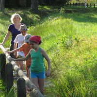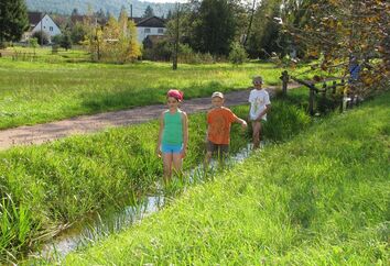 Schuhe aus und los! Auf 1,6 km kann man mit seinen Füßen an 10 Erlebnisstationen allerhand ertasten: weichen Waldboden und raue Baumrinde, gefolgt von einem sandigen Stück mit vielseitigen Balancierstationen. Die Schotterstrecke ist eine echte Herausforderung. Wer schafft alle Grobheitsstufen? Zum Glück kann man jederzeit auf den weichen Rasen ausweichen. Über Wiese und Naturstein führt der Weg weiter durch eine Schlammbett und zwei kleine Bachläufe, auf deren Grund verschiedene Materialien zu fühlen sind, zurück zum Ausgangspunkt.