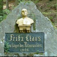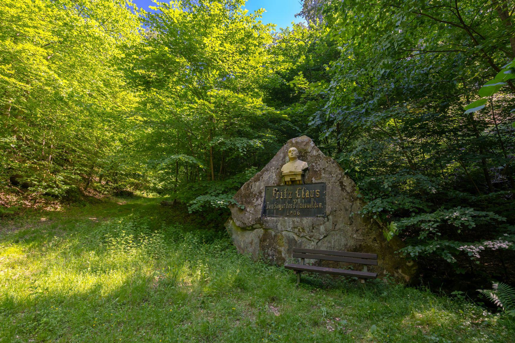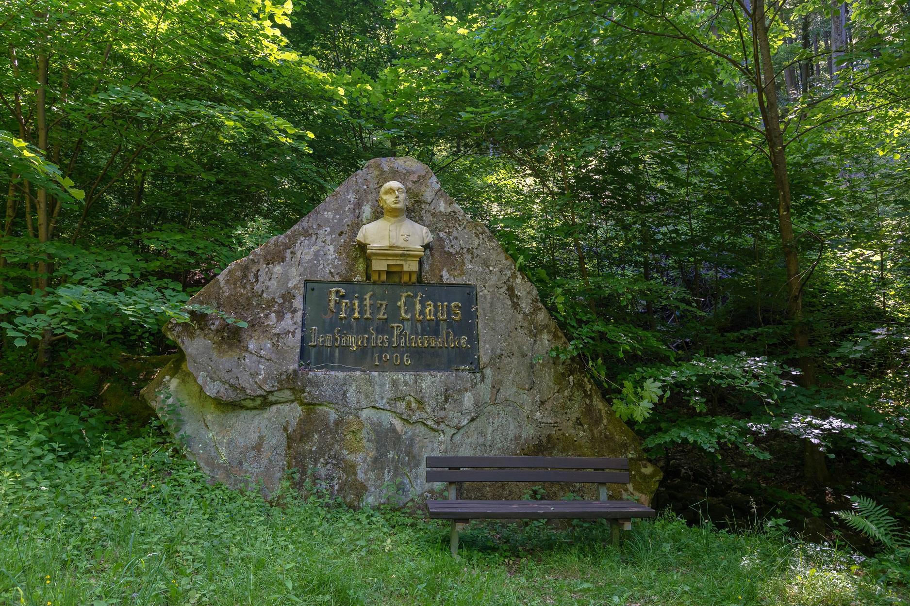Denkmal zu Ehren von Fritz Claus, dem "Sänger des Pfälzerwaldes", auf einer großen, dreieckigen Felsplatte. Eigentlich hieß der Mann Johannes Martin Jäger. Fritz Claus war nur sein Dichtername, eine Art Pseudonym sozusagen. Martin Jäger hatte am 5. August 1853 das Licht der Welt in Martinshöhe erblickt. Sein Vater, Johann Jäger, stammte aus Münchweiler an der Rodalb. Fritz Claus weihte am 20. Mai 1907 im Schamborner Tal, unweit der Gräfensteiner Gemeinde Leimen/Pfalz, sein Denkmal selbst ein. Sein umfangreiches dichterisches Schaffen hat ihm in der pfälzischen Heimatliteratur ein ewiges Denkmal gesetzt. Er studierte Theologie in München und war von 1893 bis 1909 Stadtpfarrer von Zweibrücken. Im Jahre 1910 wurde er als Dekan nach Edenkoben versetzt, wo er als Geistlicher Rat am 6. Februar 1923 starb. Bereits 1884 brachte Johannes Martin Jäger den ersten Band seines Büchleins „Fröhlich Pfalz, Gott erhalt’s“ - Gedichte und Sagen heraus. Er publizierte viele weitere Bücher. 1902 war er einer der Initiatoren zur Gründung des Pfälzerwald Vereines. Seinem Einsatz ist die Errichtung des Luitpoldturms auf dem Weißenberg beim Hermersberger Hof zu verdanken.