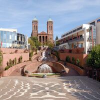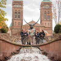 Mitten in der Pirmasenser Fußgängerzone, findet sich das imposante Wahrzeichen der Stadt. Darüber ragt der Stierkopf und die Pirminius-Kirche, die zusammen einen einmaligen Blick bilden.