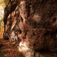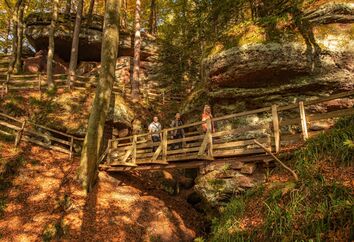 Im Pirmasenser Ortsteil Niedersimten im Naherholungsgebiet Gersbachtal bilden die imposanten Felsgruppen Teufelsfelsen und Haspelfelsen einen Einblick in die geologische Beschaffenheit des pfälzischen Buntsandsteins.