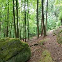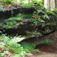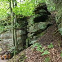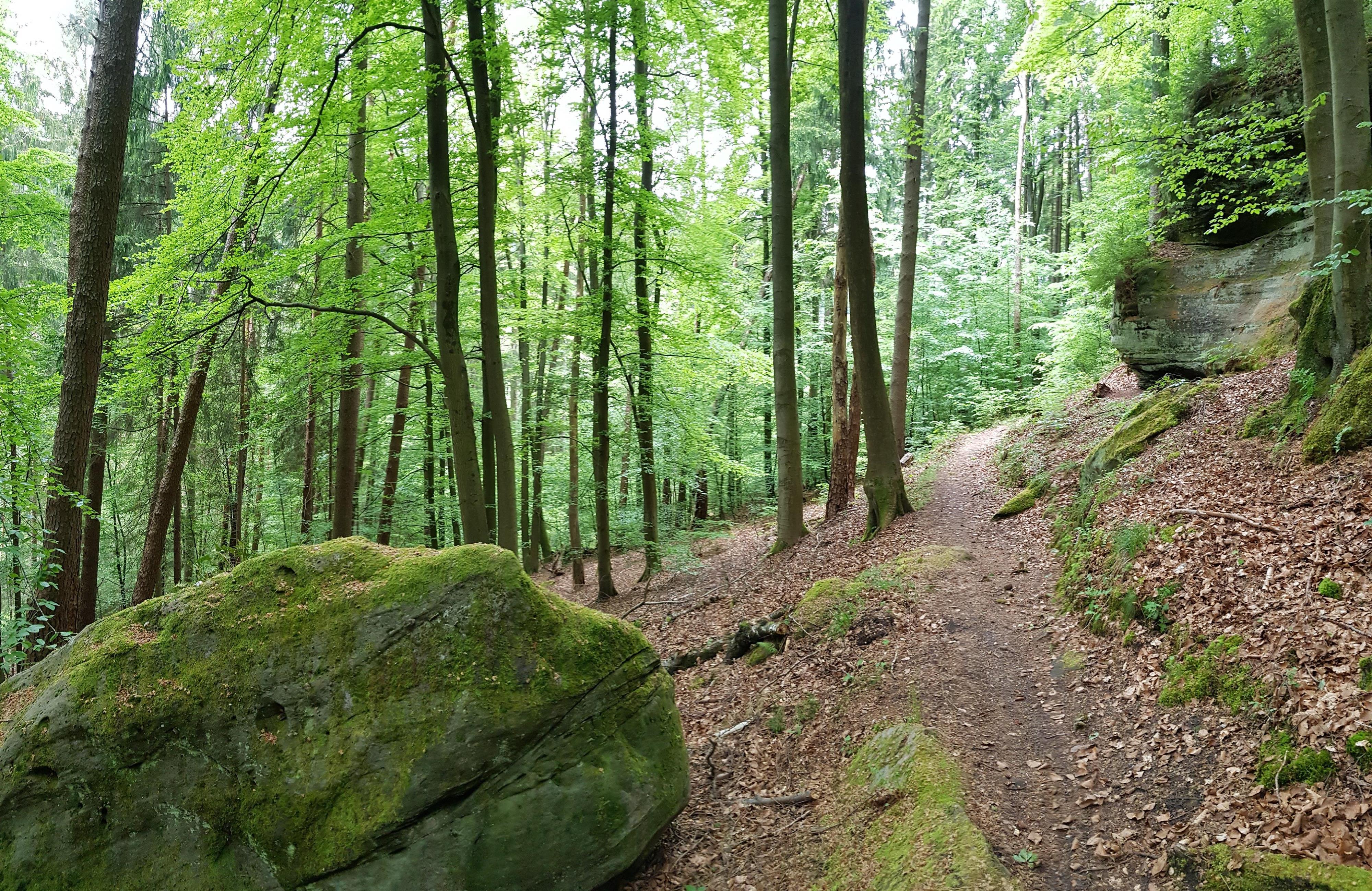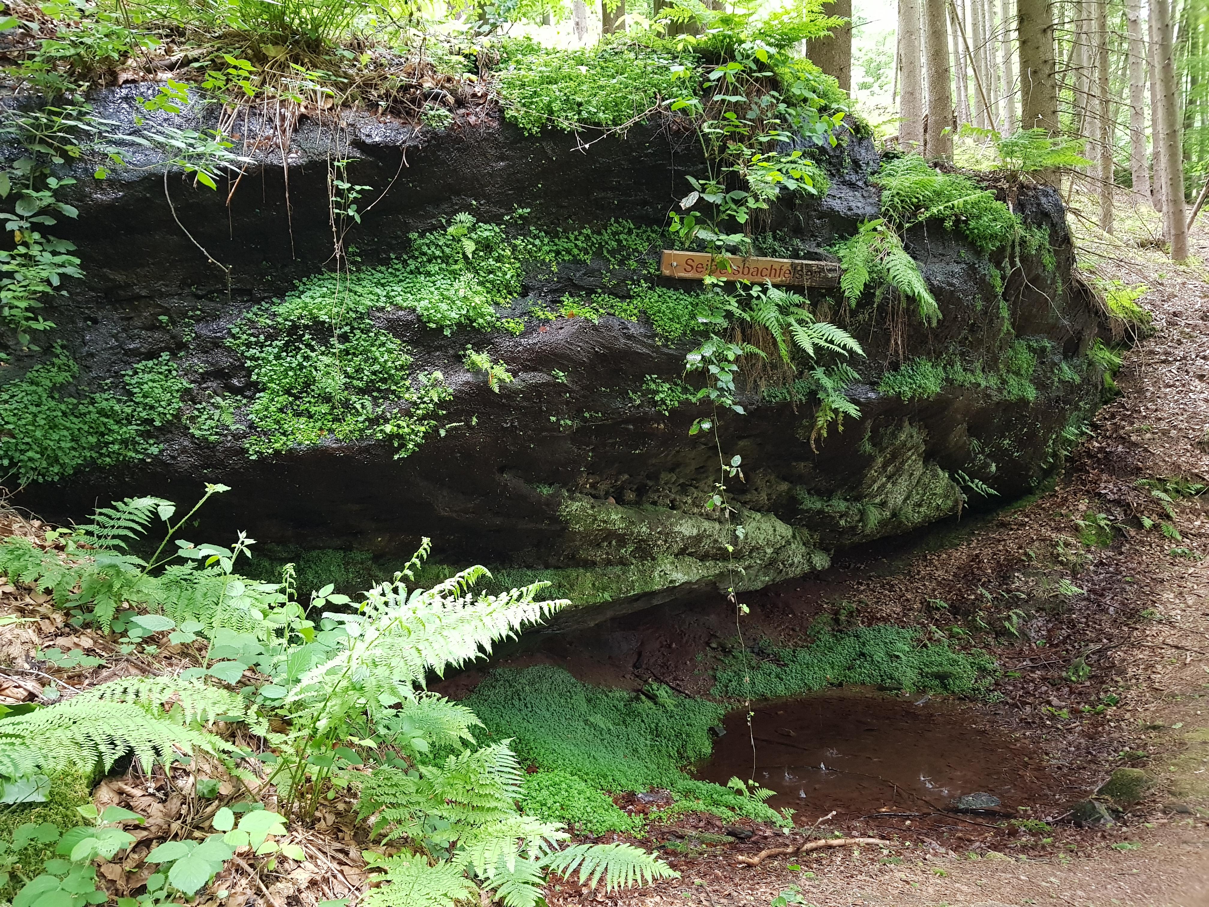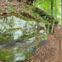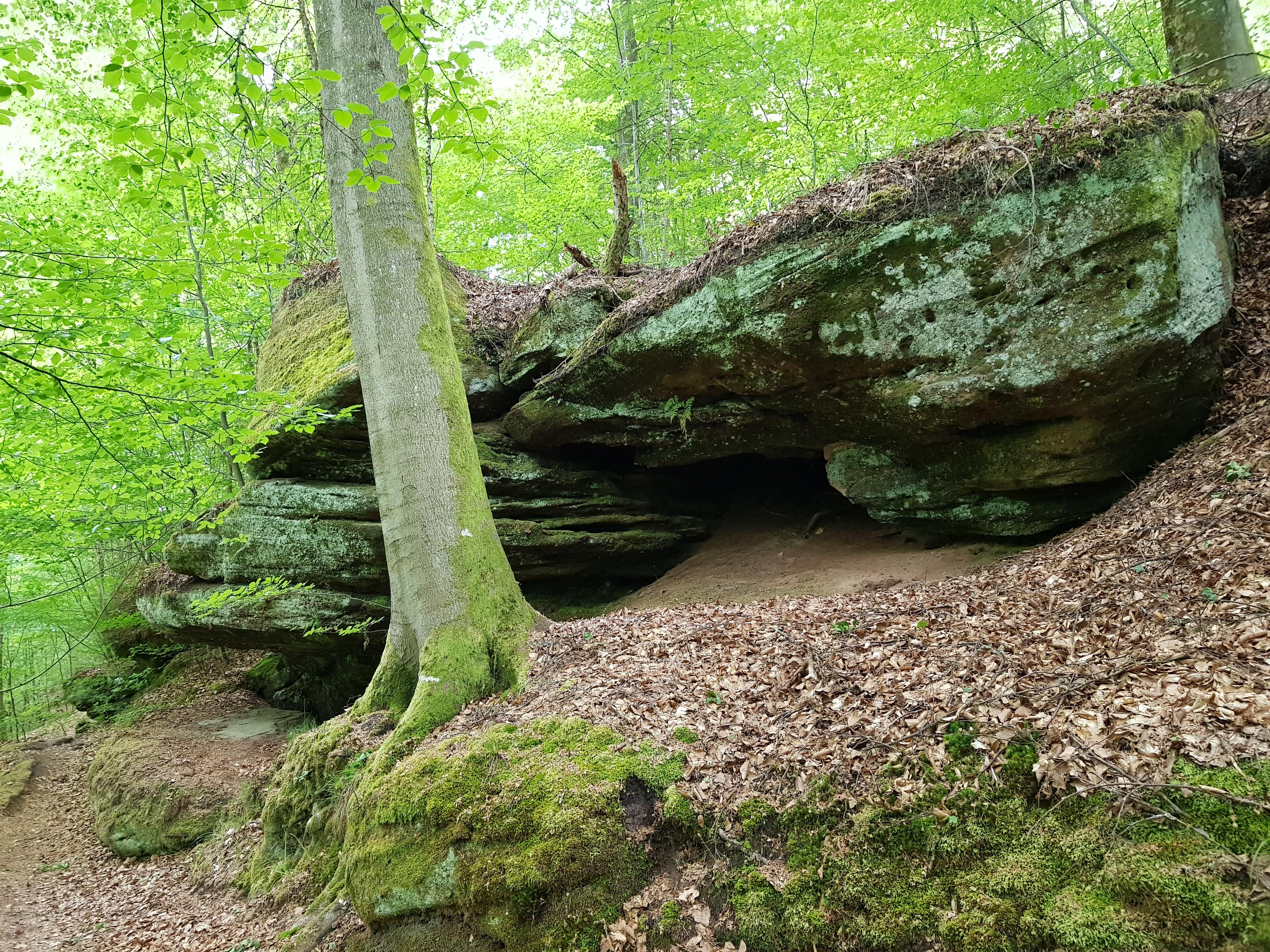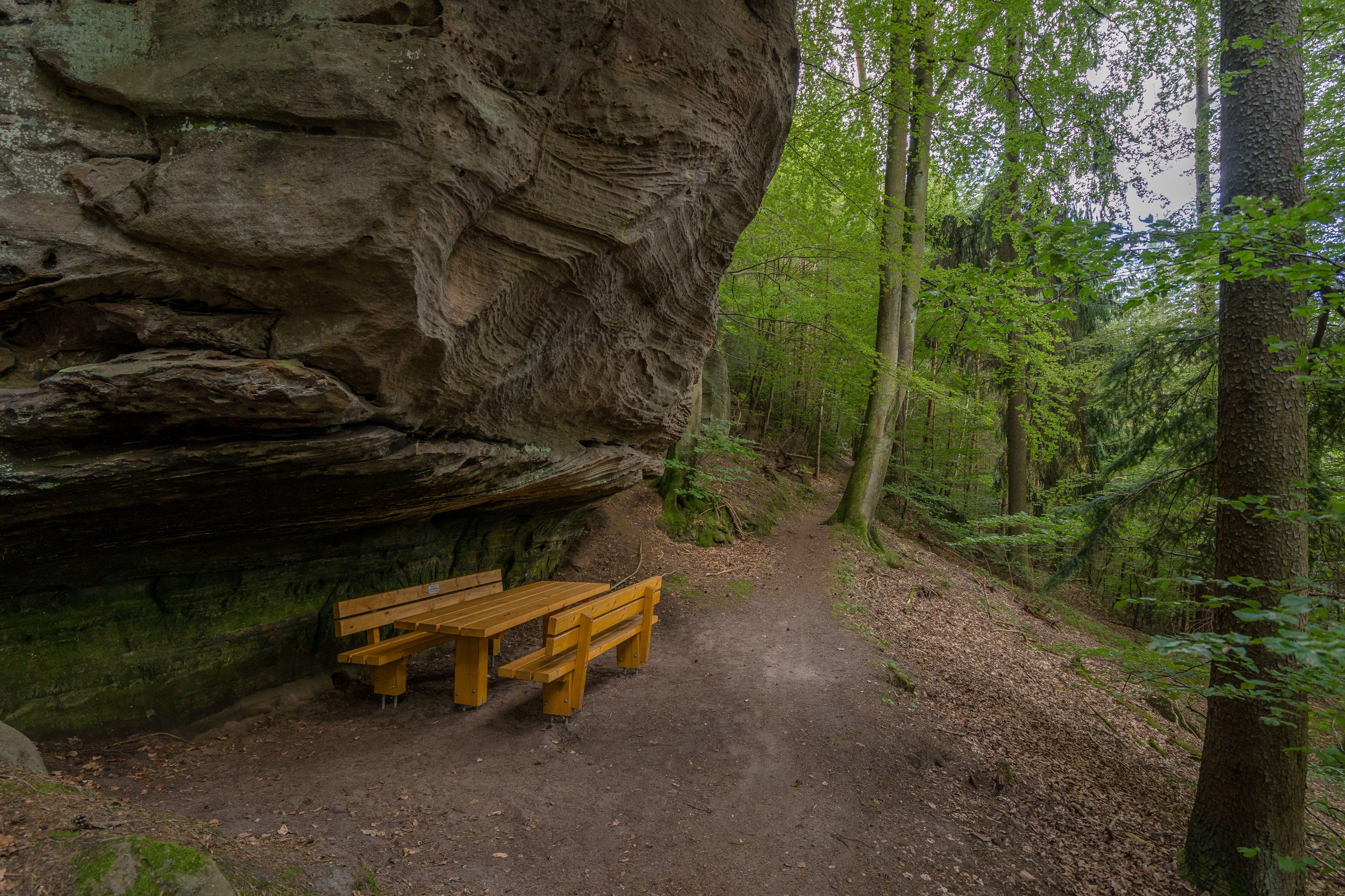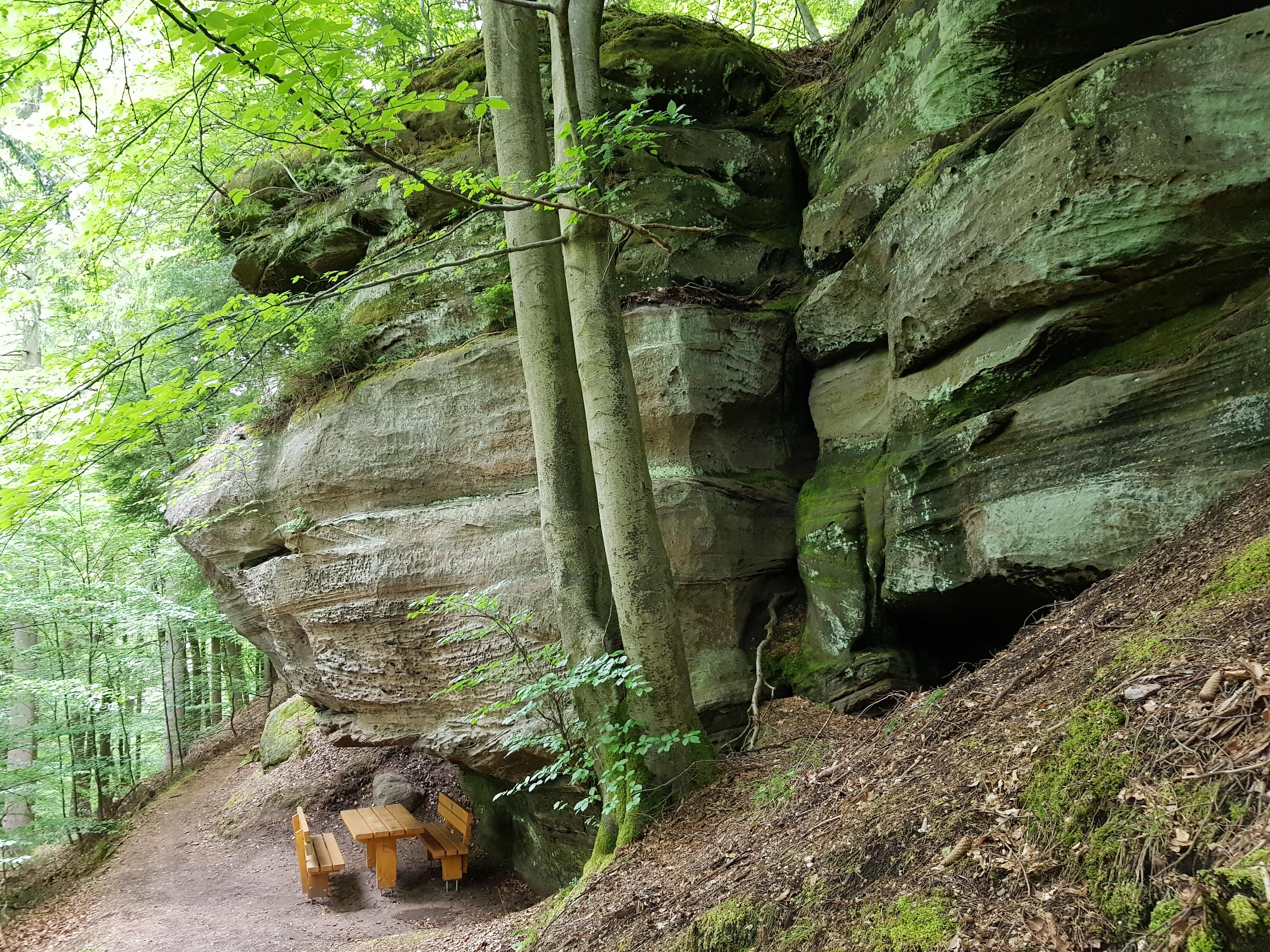 Beim Wüstlangenbachfelsen handelt es sich um eine beindruckende Formation aus Buntsandstein am bekannten Rodalber Felsenwanderweg des Gräfensteiner Landes, unter deren Felsvorsprung eine gemütliche Sitzgruppe steht, an der man auch bei Regen geschützt und trocken rasten, picknicken und verweilen kann.