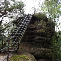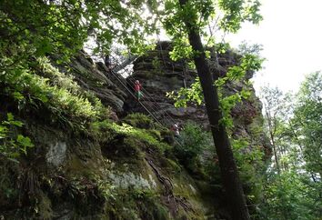 Mächtiges Felsmassiv „Wachtfelsen“ mit einer abgesicherten Felskanzel.