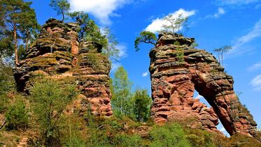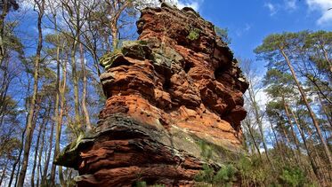 Teufelstisch, Braut & Bräutigam, Jungfernsprung… die Namen und Legenden die sich um sie ranken sind fast so bizarr wie ihre Erscheinung. Der Bundsandstein und die daraus bestehenden Felstürme bestimmen die Landschaft des Pfälzerwalds. Entstanden sind sie im Perm und Trias vor über 250 Millionen Jahren, als sich über 500 m mächtige Sedimentschichten im Gebiet des heutigen Pfälzerwaldes abgelagert haben. Durch Beimengungen von Eisenoxid erhielten sie ihre charakteristische rote Farbe. Ihre heutige Form erhielten sie durch die Erosion der letzten 5 Millionen Jahre. Im Mittelalter dienten sie nicht nur als Sockel oder Fundament für die unzähligen Burgen, sondern wurden auf Grund ihrer leichten Bearbeitbarkeit, häufig in den Burgbau mit einbezogen.