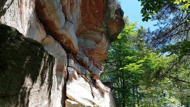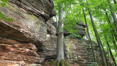 Mächtige Felsformation aus Buntsandstein nahe Merzalben.