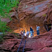 Über eine Leiter gelangt man ins Herz dieses mächtigen Felsens und hat einen herrlichen Blick auf die benachbarten „Lämmerfelsen“.