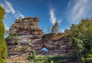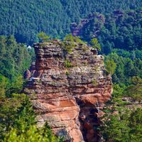 Teufelstisch, Braut & Bräutigam, Jungfernsprung… die Namen und Legenden die sich um sie ranken sind fast so bizarr wie ihre Erscheinung. Der Bundsandstein und die daraus bestehenden Felstürme bestimmen die Landschaft des Pfälzerwalds. Entstanden sind sie im Perm und Trias vor über 250 Millionen Jahren, als sich über 500 m mächtige Sedimentschichten im Gebiet des heutigen Pfälzerwaldes abgelagert haben. Durch Beimengungen von Eisenoxid erhielten sie ihre charakteristische rote Farbe. Ihre heutige Form erhielten sie durch die Erosion der letzten 5 Millionen Jahre. Im Mittelalter dienten sie nicht nur als Sockel oder Fundament für die unzähligen Burgen, sondern wurden auf Grund ihrer leichten Bearbeitbarkeit, häufig in den Burgbau mit einbezogen.