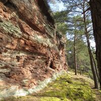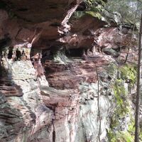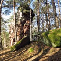 Teufelstisch, Braut & Bräutigam, Jungfernsprung… die Namen und Legenden die sich um sie ranken sind fast so bizarr wie ihre Erscheinung. Der Bundsandstein und die daraus bestehenden Felstürme bestimmen die Landschaft des Pfälzerwalds. Entstanden sind sie im Perm und Trias vor über 250 Millionen Jahren, als sich über 500 m mächtige Sedimentschichten im Gebiet des heutigen Pfälzerwaldes abgelagert haben. Durch Beimengungen von Eisenoxid erhielten sie ihre charakteristische rote Farbe. Ihre heutige Form erhielten sie durch die Erosion der letzten 5 Millionen Jahre. Im Mittelalter dienten sie nicht nur als Sockel oder Fundament für die unzähligen Burgen, sondern wurden auf Grund ihrer leichten Bearbeitbarkeit, häufig in den Burgbau mit einbezogen.