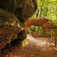 Teufelstisch, Braut & Bräutigam, Jungfernsprung… die Namen und Legenden die sich um sie ranken sind fast so bizarr wie ihre Erscheinung. Der Bundsandstein und die daraus bestehenden Felstürme bestimmen die Landschaft des Pfälzerwalds. Entstanden sind sie im Perm und Trias vor über 250 Millionen Jahren, als sich über 500 m mächtige Sedimentschichten im Gebiet des heutigen Pfälzerwaldes abgelagert haben. Durch Beimengungen von Eisenoxid erhielten sie ihre charakteristische rote Farbe. Ihre heutige Form erhielten sie durch die Erosion der letzten 5 Millionen Jahre. Im Mittelalter dienten sie nicht nur als Sockel oder Fundament für die unzähligen Burgen, sondern wurden auf Grund ihrer leichten Bearbeitbarkeit, häufig in den Burgbau mit einbezogen.