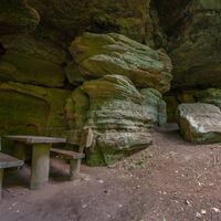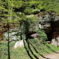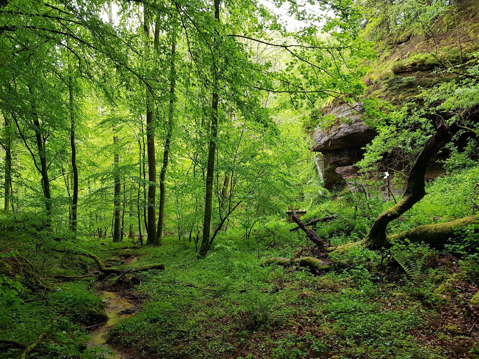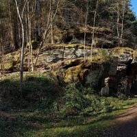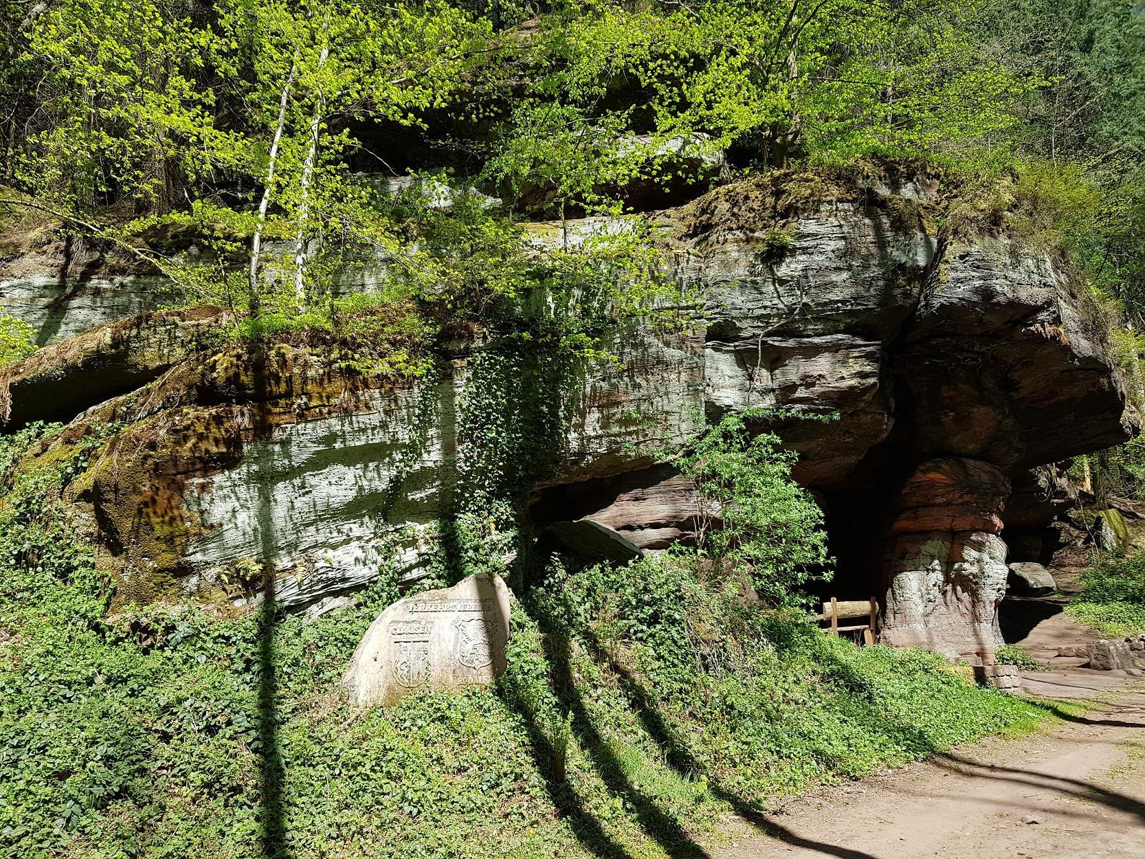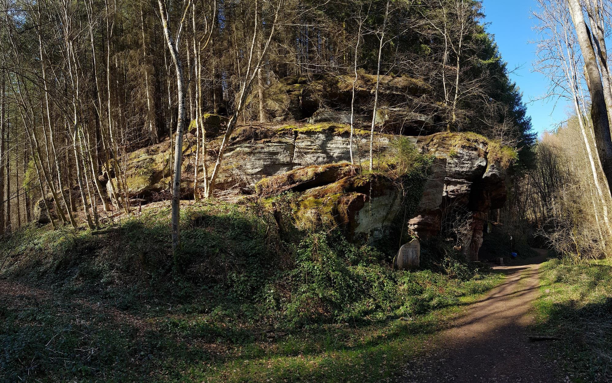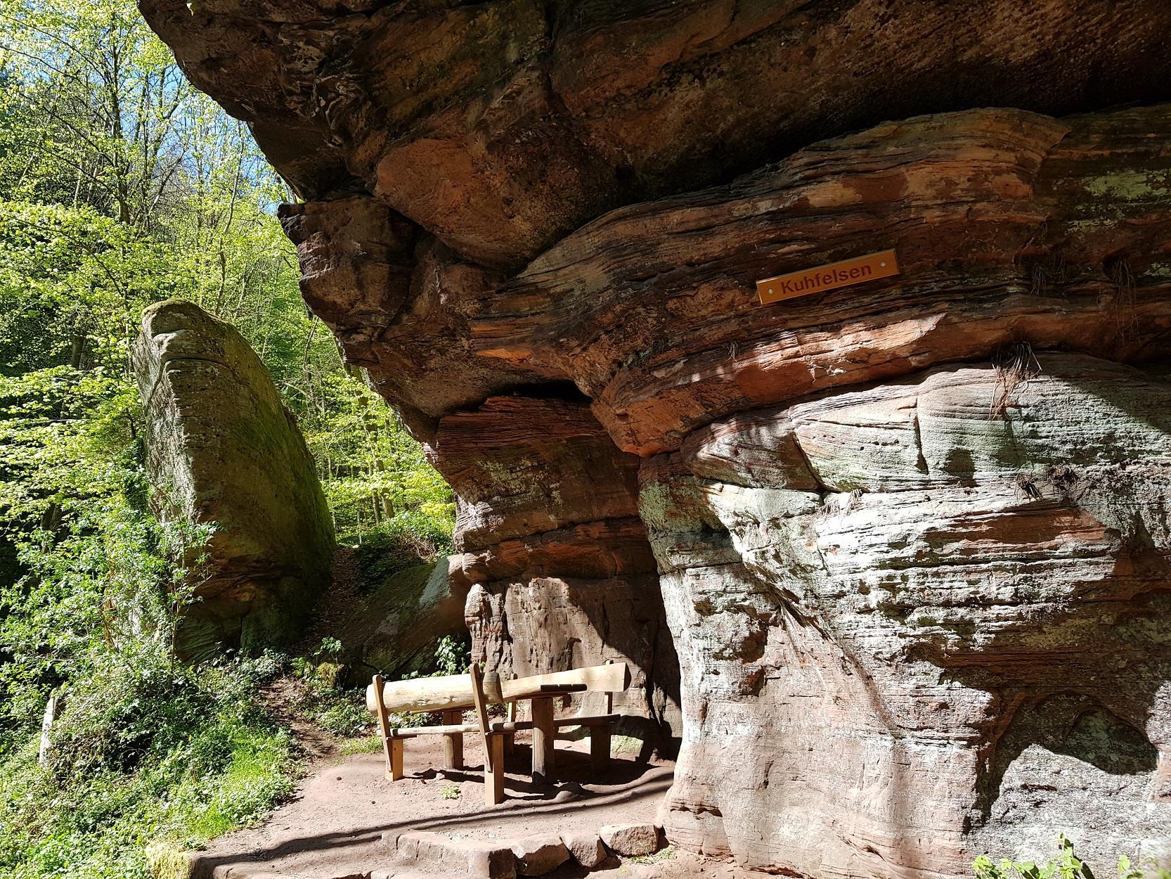 Man erreicht den Kuhfelsen im Übrigen auch über die beiden, etwas breiteren Talwege vom Wanderparkplatz am Hirschbrunnen aus, der sich an der L497 zwischen Rodalben und Münchweiler/Rodalb befindet.