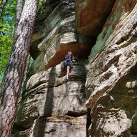 Teufelstisch, Braut & Bräutigam, Jungfernsprung… die Namen und Legenden die sich um sie ranken sind fast so bizarr wie ihre Erscheinung. Der Bundsandstein und die daraus bestehenden Felstürme bestimmen die Landschaft des Pfälzerwalds. Entstanden sind sie im Perm und Trias vor über 250 Millionen Jahren, als sich über 500 m mächtige Sedimentschichten im Gebiet des heutigen Pfälzerwaldes abgelagert haben. Durch Beimengungen von Eisenoxid erhielten sie ihre charakteristische rote Farbe. Ihre heutige Form erhielten sie durch die Erosion der letzten 5 Millionen Jahre. Im Mittelalter dienten sie nicht nur als Sockel oder Fundament für die unzähligen Burgen, sondern wurden auf Grund ihrer leichten Bearbeitbarkeit, häufig in den Burgbau mit einbezogen.