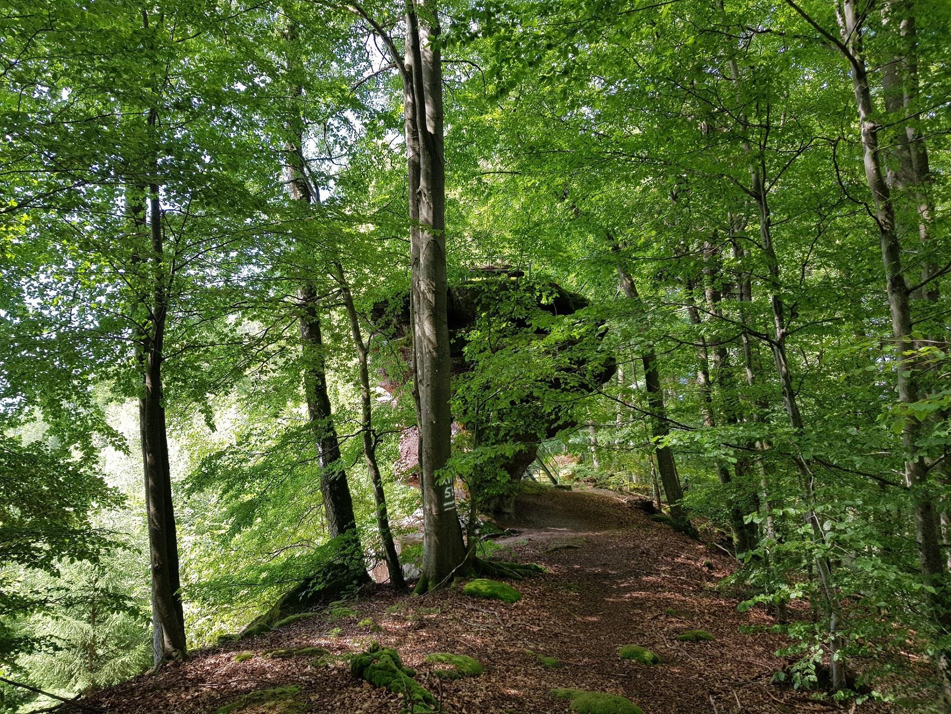 Teufelstisch, Braut & Bräutigam, Jungfernsprung… die Namen und Legenden die sich um sie ranken sind fast so bizarr wie ihre Erscheinung. Der Bundsandstein und die daraus bestehenden Felstürme bestimmen die Landschaft des Pfälzerwalds. Entstanden sind sie im Perm und Trias vor über 250 Millionen Jahren, als sich über 500 m mächtige Sedimentschichten im Gebiet des heutigen Pfälzerwaldes abgelagert haben. Durch Beimengungen von Eisenoxid erhielten sie ihre charakteristische rote Farbe. Ihre heutige Form erhielten sie durch die Erosion der letzten 5 Millionen Jahre. Im Mittelalter dienten sie nicht nur als Sockel oder Fundament für die unzähligen Burgen, sondern wurden auf Grund ihrer leichten Bearbeitbarkeit, häufig in den Burgbau mit einbezogen.